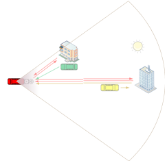 A1.Flash面發(fā)射體制決定需要大視場角焦平面陣列形式接收(如圖1所示),因此增大了視場角內的背景光與干擾光接收概率與能量,使得傳感器積分過程獲得的總信號量中無效信號占據極高比例,降低了有效回波能量的SNR(如圖2所示)...查看詳情>>