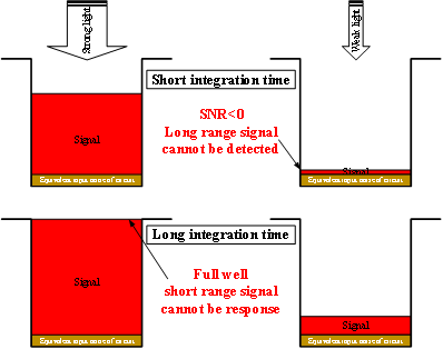 圖3 積分電容的阱容(動態(tài)范圍)限制導致短曝光無法讀出弱信號(遠距離)、長曝光無法響應強信號(近距離)